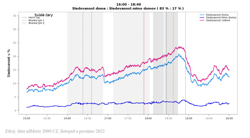Necelá pětina fanynek a fanoušků sledovala finálový zápas na MS v Kataru mezi Argentinou a Francií mimo domov. V této skupině vrcholila sledovanost poté, co Leandro Paredes proměnil pokutový kop a zvýšil vedení Argentiny v penaltovém rozstřelu na 3:1. Uvedla to výzkumná agentura Median, která provozuje měření adMeter, který měří i televizní sledovanost mimo domov.