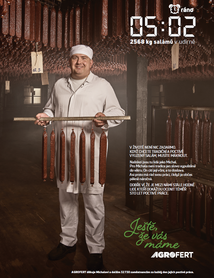 Před třemi týdny spustila skupina Agrofert nadlinkovou kampaň. Na televizní stanice ze skupiny Nova, Prima a Barrandov nasadila imageový spot, v němž představuje pracovní ráno svých zaměstnanců – zemědělců, chovatelů, řezníků, mlékařů či pekařů. Se stejnou kreativou a claimem „Ještě, že vás máme“ komunikuje i v tisku a na internetu. Do budoucna by chtěl koncern svou novou komunikační linii dále rozvíjet.