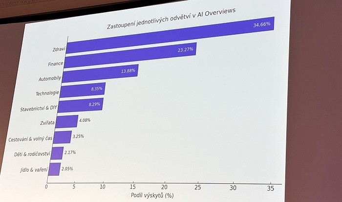 Nejvíce se v AI Overviews objevují odpovědi na dotazy ze segmentů zdravotnictví (34,6 %), finance (23,3 %) a automobily (13,9 %), přičemž nejrychleji roste oblast technologií. Nejčastějším záměrem v AI Overviews je informační hledání (90 %), přibývá ale i transakčních dotazů (zatím 5 %), tedy hledání spojeného přímo s nákupem nebo službami. Mezi příklady Novák zmínil „půjčka online“, „rakouská dálniční známka“ nebo „pronájem bytu v Praze bez provize“.