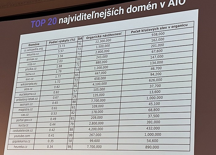 Výstupy AI Overviews typicky čerpají z více zdrojů, nejčastěji jsou to tři zdroje, průměrný medián je pět citovaných webů. „Zhruba polovina zdrojů se překrývá s weby, které jsou už tak v první desítce výsledků v organickém vyhledávání. To znamená, že viditelnost v AI Overviews je úzce spojená s organickým SEO výkonem,“ vysvětlil Novák. Mezi nejčastěji odkazované weby v AI Overviews se řadí Wikipedie, a poté zdravotnické portály (lékárna.cz, drMax.cz, pilulka.cz) nebo e-shopy typu Alza. Překvapivě se mezi nejúspěšnější dostal i menší afilliate web pribalovy-letak.cz.