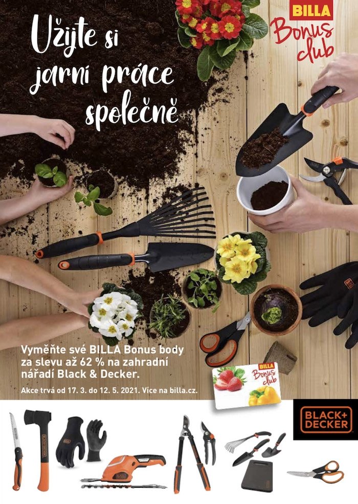 Billa odstartovala 17. března novou věrnostní kampaň, určenou pro členy Billa Bonus clubu. Tentokrát jim za klubové body nabídne za zvýhodněné ceny zahradnické náčiní značky Black & Decker.