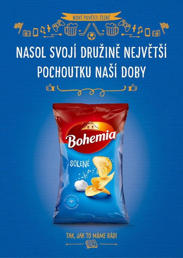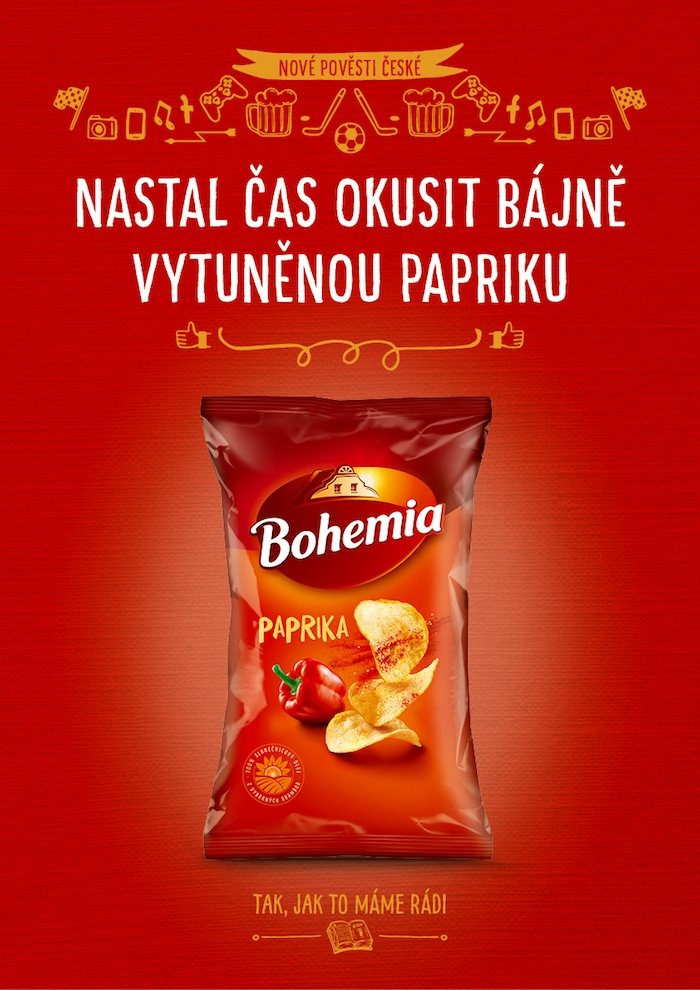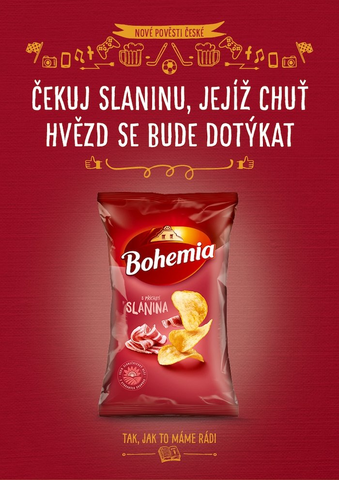 Značka Bohemia Chips z portfolia společnosti Intersnack spustila nový dlouhodobý komunikační koncept z dílny agentury Hullabaloo. V sobě má kombinovat tradiční hodnoty na jedné straně a zábavu, hravost a chuť na straně druhé. Jejím cílem kampaně s názvem „Nové pověsti české“ je přilákat mladší cílovou skupinu a zároveň oslovit i tradiční konzumenty.
