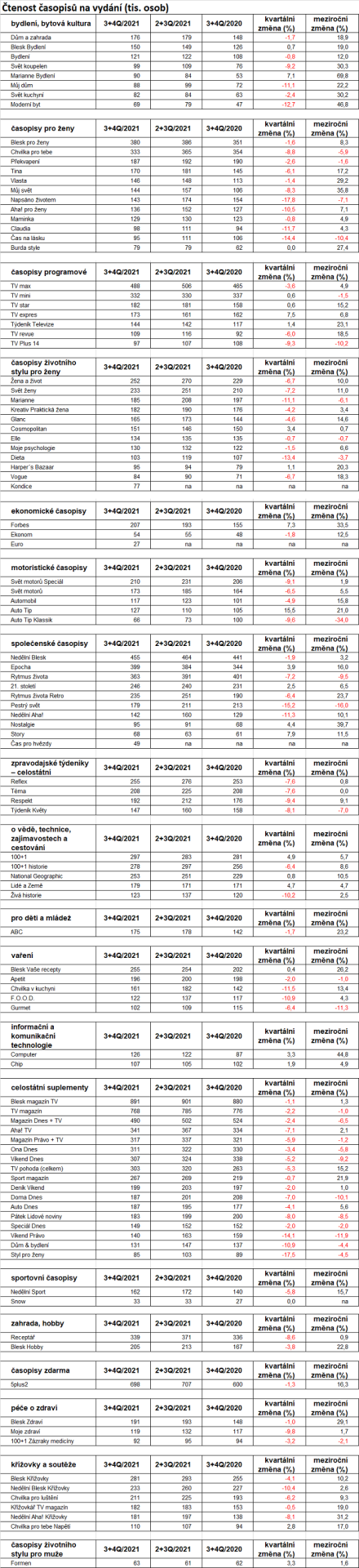 Čtenářem alespoň jednoho časopisu vydávaného v Česku je 75 % občanů ve věku 12 – 79 let, tj. absolutně 6,7 mil. osob. Je to srovnatelný výsledek jako ve stejném období před rokem (rovněž 6,7 mil. osob) a o jeden procentní bod méně než v posledním měřeném období za druhé a třetí čtvrtletí 2021. Ukazují to data výzkumu Media projekt za 3. a 4. kvartál 2021.