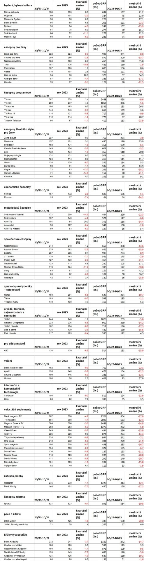 K nejčtenějším časopisům nadále paří magazíny společenské, programové a pro ženy. Nejvyšší nárůsty si připsaly časopisy Čas na lásku a Auto Tip ve srovnání s daty za rok 2023 a pokud by se zohlednilo i meziroční srovnání, tak se k nim řadí i Čas pro hvězdy.