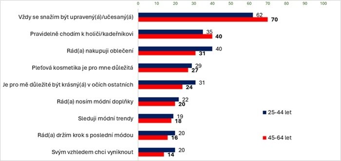 Když pomineme rozdíl mezi pohlavími, tak rozdíl mezi mladšími a zralejšími Čechy v přístupu k vlastnímu zevnějšku nebo módě není nijak dramatický. V něčem naopak zralejší Češi vedou a rozhodně se chtějí udržovat! Navíc je dobré vnímat data v souvislostech. Zjistíte tak, že ani mladší Češi nejsou žádní velcí fešn fríci …
