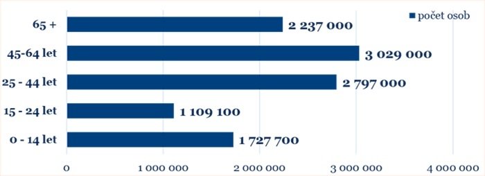 Když rozdělíme českou populaci podle věku do věkových podskupin, dostaneme následující čísla (stav ke konci roku 2023, zdroj ČSÚ):