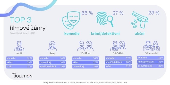 Z pohledu filmových žánrů je mezi českými diváky celkově nejoblíbenější je mezi českými diváky komedie, kterou ve svém žebříčku TOP 3 žánrů uvádí více než polovina respondentů (55 %). Následuje krimi/detektivní žánr (27 %) a akční filmy (23 %). Celkovou TOP pětici uzavírají romantické filmy (21 %) a shodně s 18 % odpovědí pak dokumentární filmy, sci-fi a thrillery. Naopak nejméně populární jsou westerny a muzikály (oba shodně 4 %).