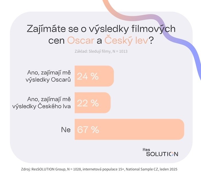 Většina českých diváků (67 %) se nezajímá o výsledky filmových cen, ať už amerických Oscarů, nebo tuzemského Českého lva. Atraktivnější jsou přitom jejich výsledky pro ženy než pro muže. Výsledky Oscarů zajímá čtvrtinu dotázaných, ale velmi podobný zájem je i o Českého lva, který poutá pozornost více než pětiny lidí. Co se týče zájmu ve věkových skupinách, tak u nejmladší kategorie do 34 let vítězí s přehledem Oscaři (zajímají 26 % dotázaných v tomto věku, Český lev pouze 14 %), střední kategorii od 35 do 54 let zajímají Oscaři a české ceny zhruba stejně (22 % vs. 21 %) a u nejstarší skupiny nad 55 let se preference otáčejí a o něco více je láká Český lev (32 %) než Oscaři (26 %).