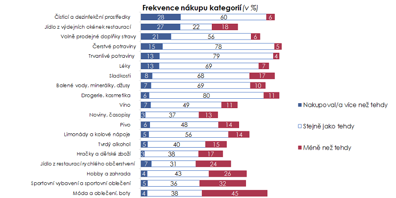 Zkušenost s online nakupováním se oproti listopadové vlně příliš nezměnila. U 44 % lidí šíření koronaviru nemá vliv na množství jejich uskutečněných online nákupů, tito lidé nakupují online stejně jako předtím. Pandemie nejvíce zvýšila frekvenci online nákupů zejména v kategoriích oblečení a boty, sportovní vybavení, léky a doplňky stravy, kosmetika a drogerie, potraviny a nábytek.