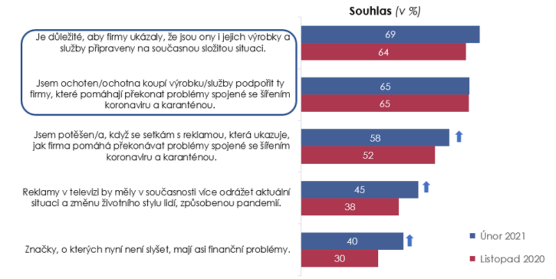 Podobně jako v minulé vlně až dvě třetiny lidí považují za důležité, aby firmy ukázaly svoji připravenost na současnou složitou situaci a jsou také ochotné podporovat firmy, které pomáhají překonat problémy spojené s koronavirem. Mírně roste přesvědčení, že reklamy by měly reflektovat aktuální situaci a ukazovat zapojení firem do řešení problémů. S tímto tvrzením vyjádřilo v únoru souhlas 45 % respondentů, zatímco v listopadu to bylo 38 %.