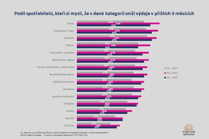 Detailní pohled na kategorie, ve kterých Češi šetří, ukazuje, že nejvíc spotřebitelů omezuje nadále výdaje v restauracích a barech (61 %), za sladkosti (58 %) a za módu (56 %). Více než polovina obyvatel (53 %) šetří rovněž na základních potravinách. Naopak nejméně lidé omezili výdaje za domácí mazlíčky (30 %), spoření (31 %) a hračky (35 %).
