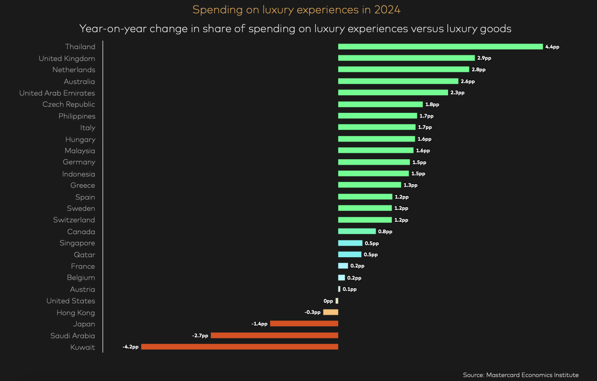 Češi stále častěji upřednostňují jedinečné zážitky před materiálními nákupy, přičemž jedním z nejrychleji rostoucích segmentů je wellness. Nová data Institutu pro ekonomiku (Mastercard Economics Institute, MEI) společnosti Mastercard ukazují, že výdaje ve wellness resortech u nás meziročně vzrostly o 1,9 procentního bodu, což Česko řadí na druhé místo mezi sledovanými zeměmi, hned za Thajskem. Celkově výdaje na luxusní zážitky vzrostly v Česku meziročně o 1,8 procentního bodu.