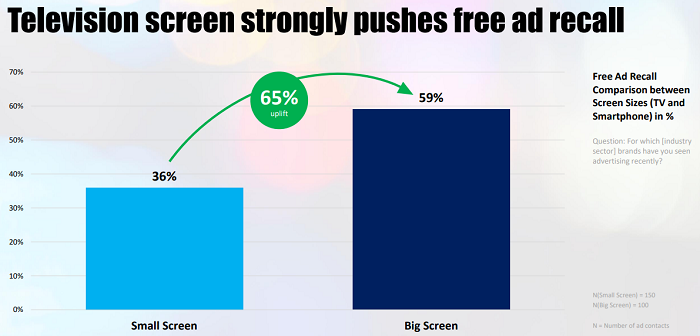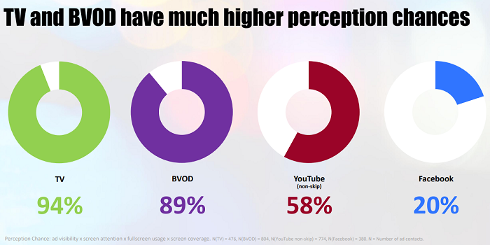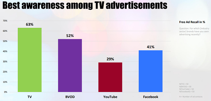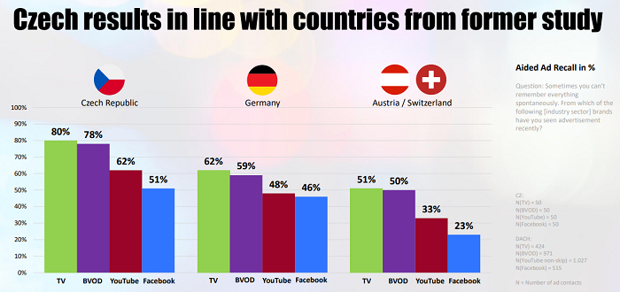 Podpořené vybavení reklamy je ze sledovaných platforem v Česku nejvyšší v případě, že je reklama sledována na televizní obrazovce (80 %) a z BVOD (78 %), následované Youtube (62 %) a Facebookem (51 %). Také spontánní vybavenost reklamy je nejvyšší v televizi (63 %) a BVOD (52 %). Obě zmíněné mají také nejvyšší šance z pohledu vnímání reklamy, což souvisí s viditelností reklamy, pozorností věnované obrazovce a velikosti zobrazení reklamy.