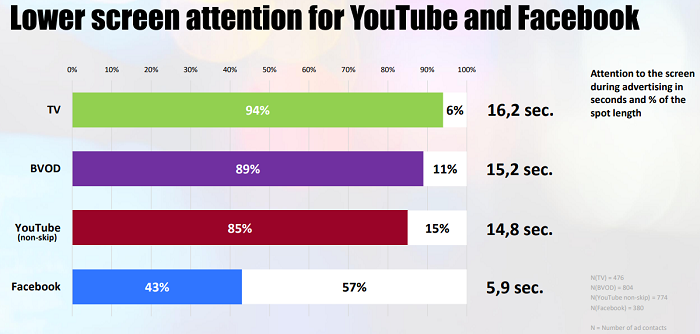 V roce 2020 uskutečnila agentura studii Not all Reach is Equal, ve které odpovídá výzkumnice Karen Nelson-Field na otázku, jak funguje videoreklama v TV a videu na vyžádání tvořeného vysílateli (BVOD – broadcasting video on demand) ve srovnání s platformami YouTube a Facebook. Na tu o rok později navázala zmíněná studie Track the Success, která sledovala faktory ovlivňující příjem reklamních sdělení na uvedených platformách v Německu, Švýcarsku a v Rakousku a sledovala, jak se identické reklamy na těchto platformách chovají. Zjistila přitom, že audiovizuální reklama dosahuje lepších výsledků na TV a BVOD než na YouTube a především než na Facebooku.