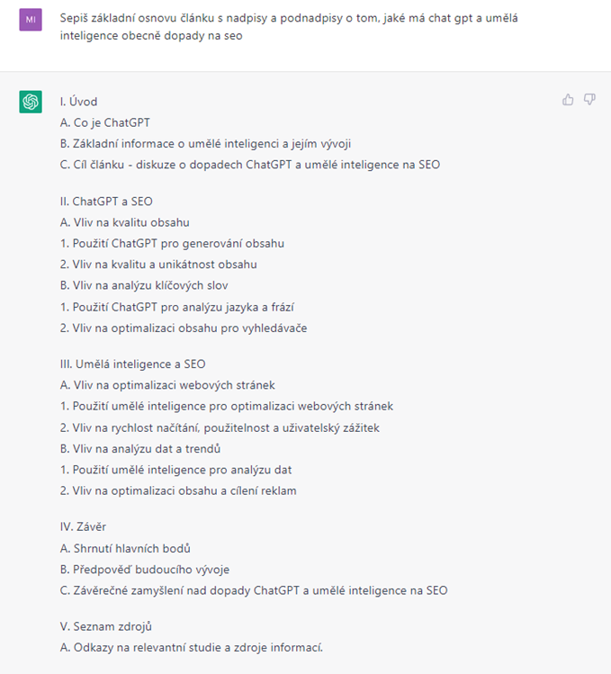 ChatGPT vám může pomoci vytvořit osnovu článku na zadané téma. To se hodí zejména v případě, že nevíte, co všechno do článku zahrnout. Pokud vaše kreativita zrovna nemá nejlepší den, tohle by ji mohlo probudit.