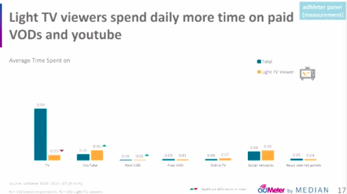 Na tzv. slabé televizní diváky (light viewers), tedy ty, kteří sledování lineární televize věnují denně hodinu a méně času, se zaměřili Josef Fišer z výzkumné agentury Median a Petr Houzar z Googlu. Podle jejich společného průzkumu představují slabí televizní diváci na českém trhu 17 % populace, přičemž jde primárně o mladší muže s vysokoškolským vzděláním, častěji studenty z vícepočetných domácností. Zhruba čtvrtina z nich nevlastní televizi. Slabí televizní diváci obecně více než celková populace sledují YouTube, sociální sítě, videoobsah na Aktuálně či Netflix.