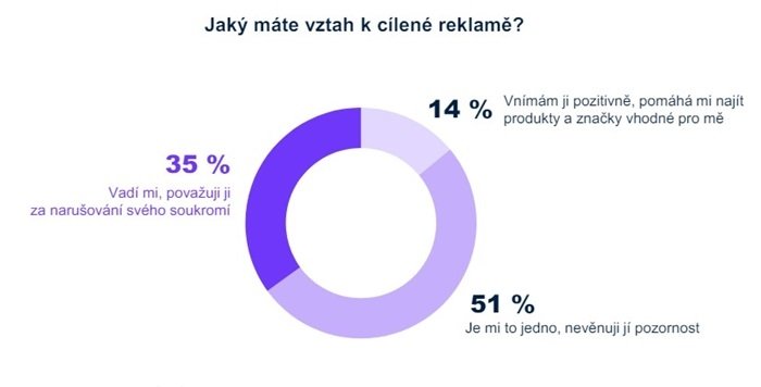 K cílené reklamě má zhruba polovina české online populace (51 %) lhostejný vztah a tomuto typu reklamy nevěnuje pozornost. Více než třetině (35 %) cílená reklama vadí a vnímá ji jako narušení soukromí. Naopak 14 % vnímá cílenou reklamu pozitivně, protože jim pomáhá najít relevantní produkty.