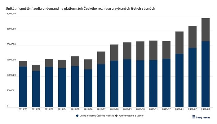 Na vlastních platformách Českého rozhlasu lidé nejvíce zpětně poslouchají obsah stanice Český rozhlas Dvojka, která má 35% podíl všech tzv. on demand posluchačů. Stanice Český rozhlas Radiožurnál a Radio Wave mají silnou základnu posluchačů prostřednictvím třetích stran. Postaraly se o téměř třetinu všech poslechů audií z produkce Českého rozhlasu v Apple Podcasts a Spotify. Velký nárůst v poslechovosti zaznamenalo i díky své nové mobilní aplikaci Rádio Junior. V březnu si lidé pustili dvakrát více audií Rádia Junior než v únoru.