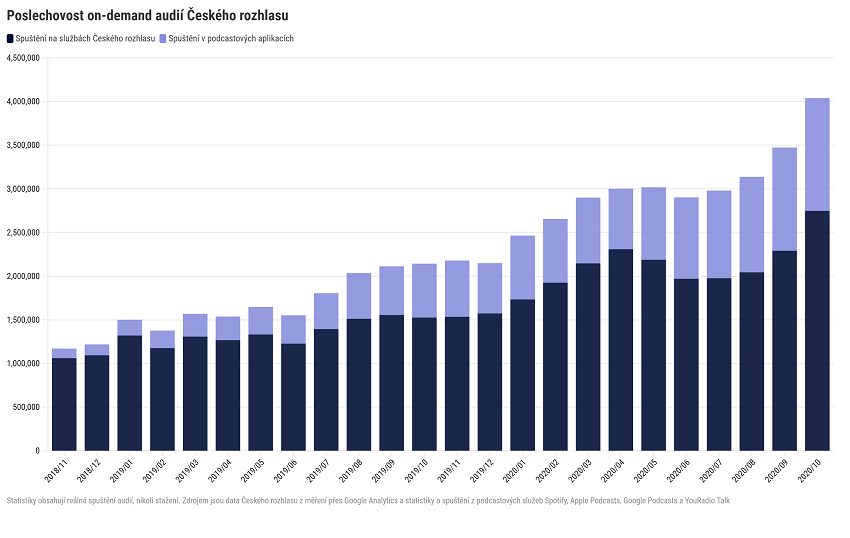 Český rozhlas v říjnu zaznamenal rekordní on demand (na vyžádání) poslechovost pořadů a podcastů. Na platformách Českého rozhlasu a na třetích stranách Spotify, Apple Podcast a Google Podcast si uživatelé spustili přes 4 miliony audií. Dalších necelých 2,5 milionu unikátních poslechů pak zaznamenaly video sestřihy publicistických pořadů na sociální síti YouTube. Data vycházejí z informací poskytnutých Českým rozhlasem.