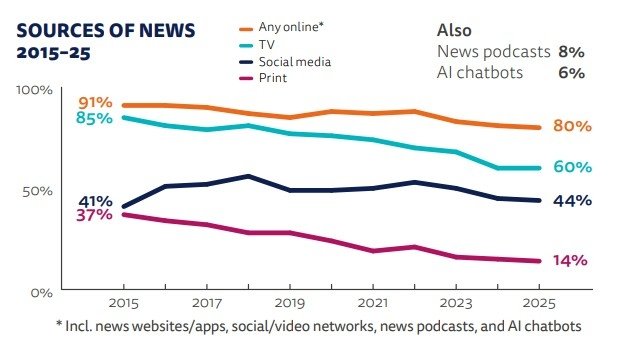 Ve většině světových zemí se tradiční zpravodajská média podle letošní studie obtížně spojují s velkou částí veřejnosti: klesá zapojení, důvěra i počet digitálních předplatných. Zrychlující se přechod ke konzumaci zpravodajství přes sociální sítě a video platformy dále oslabuje vliv „institucionální žurnalistiky“ a posiluje roztříštěné alternativní mediální prostředí v podobě podcasterů, youtuberů a tvůrců na TikToku. Tyto trendy jsou nejvýraznější ve Spojených státech, ale také v částech Asie, Latinské Ameriky a východní Evropy.