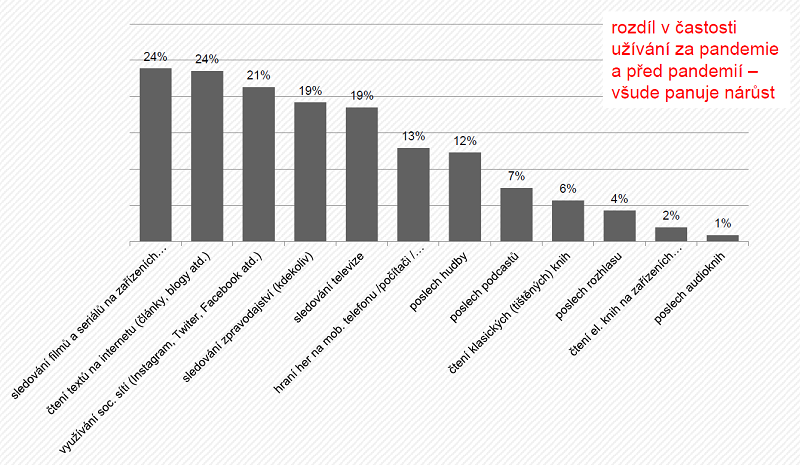 K mediálním aktivitám s největším nárůstem v době pandemie (rozdíl v počtu těch, kdo se dané aktivitě věnují více než v době před pandemií a méně než v době před pandemií) patří sledování filmů a seriálů (+24 % růst), četba textů na internetu (+24 %), využívání sociálních sítí (+21 %), sledování zpravodajství (+19 %) a sledování televize (+19 %). Naopak k mediálním aktivitám, kterým se v době pandemie věnují Češi zhruba se stejnou intenzitou jako před ní, patří poslech audioknih, četba elektronických knih a poslech rozhlasu.