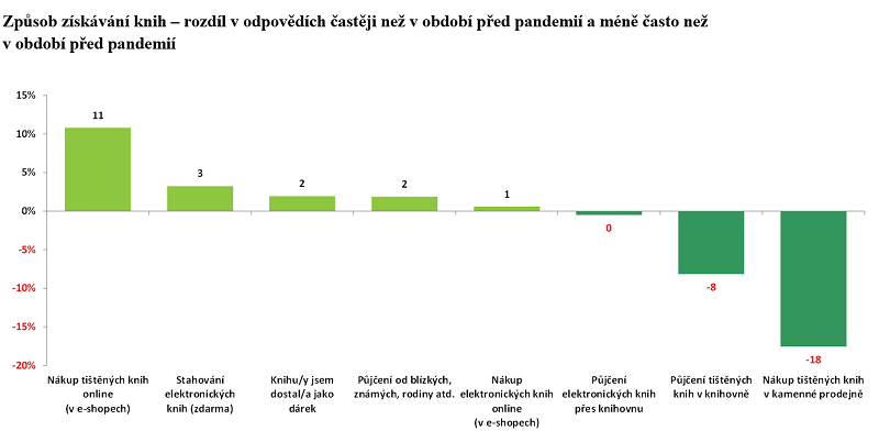 Přestože knihkupectví byla značnou část uplynulého roku zavřena, výsledky výzkumu naznačují, že koronavirová pandemie nákup knih (alespoň z pohledu respondentů) zase tolik významně neovlivnila. Změnil se však zásadně způsob získávání knih. Téměř o pětinu se snížil počet těch, kteří nakupují knihy v tradiční (kamenné) prodejně, naopak narostly všechny aktivity v online prostředí, zejména nákup tištěných knih v online obchodech. Knihy jsme také méně často získávali v knihovně.