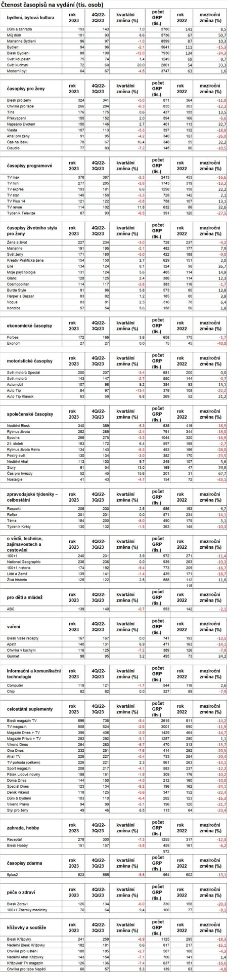 K časopisům, které si ve čtenosti nejvíce polepšily ve srovnání s předešlým měřeným obdobím (tj. obdobím od konce třetího čtvrtletí 2023), se řadí tituly Svět kuchyní, Čas na lásku, Čas pro hvězdy a Story. V meziročním srovnání se pak nejvíce dařilo časopisům Čas pro hvězdy, Můj dům, Elle, Gurmet a Svět kuchyní.