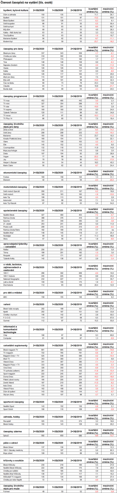 Čtenářem alespoň jednoho časopisu vydávaného v České republice je 77 % občanů ve věku 12 – 79 let, tj. absolutně 6,8 mil. osob. Vyplývá to z dat výzkumu čtenosti Media projektu za 2. a 3. čtvrtletí 2020. Čtenost časopisů na vydání představovala v tomto období 58 % uvedené populace, což bylo stejně jako v posledním měřeném období prvního pololetí 2020 a lze ji tak charakterizovat jako stabilní.