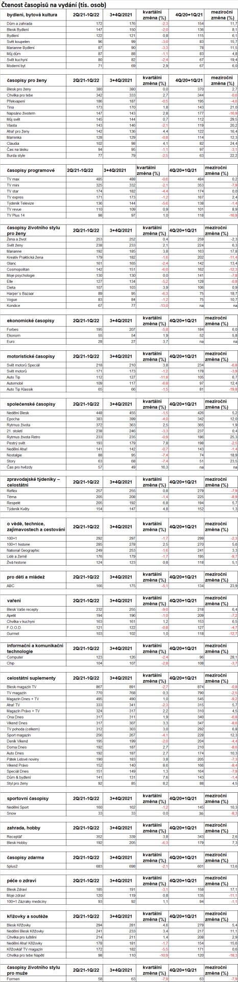 Čtenářem alespoň jednoho časopisu vydávaného v Česku je 76 % lidí ve věku 12 – 79 let, tj. absolutně 6,7 mil. osob. Je to stejný výsledek jako ve druhém pololetí roku 2021 a také jako ve stejném období loňského roku. Ukazují to nová data výzkumu Media projekt za období 2. čtvrtletí 2021 až prvního čtvrtletí 2022, která byla ve čtvrtek zveřejněna.