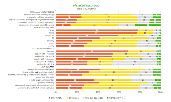 Intenzitu reklamy na komerčních televizích negativně vnímají častěji starší lidé nad 60 let, vysokoškoláci a ti, kteří uvádějí, že „reklamu nesnáší“. Reklamu na internetu považují za přílišnou častěji vysokoškoláci, ale není zde výrazný rozdíl z hlediska věku. Product placement považuje za přiměřené častěji mladá generace celkově tento způsob reklamy vnímá jako přiměřený asi polovina populace, častěji se nevyjádřili starší lidé a lidé se základním vzděláním. Na Facebooku vnímá reklamu jako přílišnou častěji střední generace ve věku 30–44 let, na Instagramu je to mladá i střední generace s tím, že mladí ji častěji považují za přiměřenou. Věková kategorie 60+ se častěji nevyjádřila. Stejně tak se tato věková skupina častěji nevyjádřila k reklamě na Twitteru a TikToku. Příliš mnoho reklamy na Twitteru uvádějí častěji muži a polovina žen se k tomu nevyjádřila. Youtube je příliš zahlcen reklamou pro mladou i střední generaci, Tik-Tok hlavně pro generaci střední.