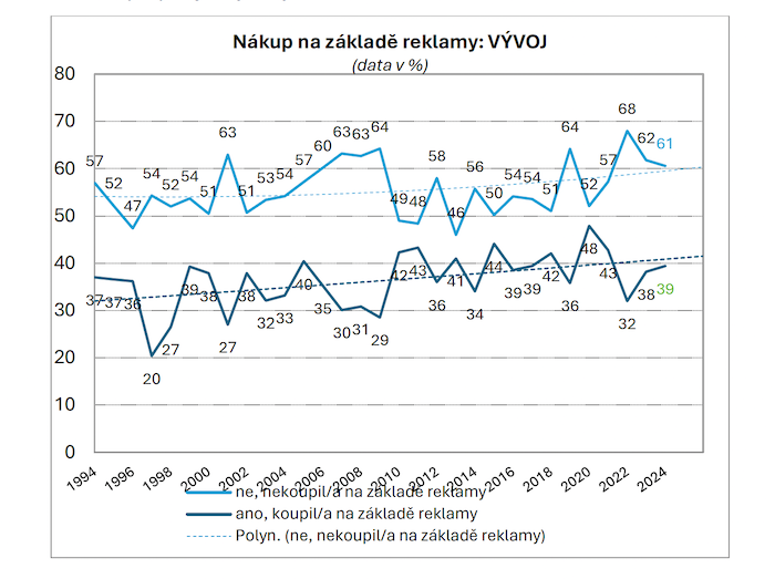 Nákup ovlivněný reklamou „přiznává“ v letošním roce přibližně 40 % populace, což odpovídá procentu těch, kteří uvádějí, že reklama jim pomáhá při nákupním rozhodování. Po celou dobu šetření se procento lidí přiznávajících nákup na základě reklamy pohybuje průměrně mezi 30–45 %. Lze předpokládat, že řada lidí nákup na základě reklamy „nepřizná“, ať již proto, že si ho neuvědomuje, nebo ho přiznat nechce. Nejčastěji lidé na základě reklamy nakupují potraviny, nápoje, elektroniku a kosmetiku.