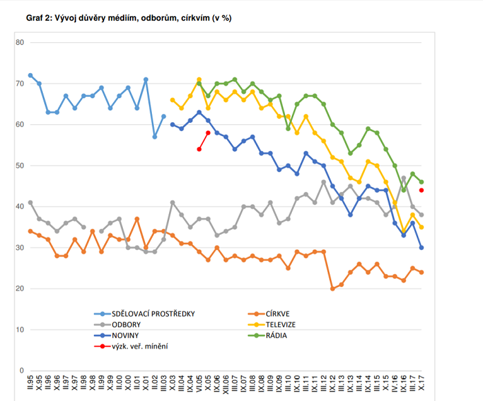 V případě médií byl v posledních 5-6 letech zaznamenáván poměrně výrazný postupný pokles důvěry, který se v březnu 2014 zastavil (během roku došlo k nárůstu důvěry zhruba o 5 procentních bodů), avšak tento stav neměl dlouhého trvání a v březnu 2015 opět nastal pokles. Podle výsledků letošního březnového šetření se sice tento pokles důvěry zastavil, ale v říjnu byl opět zaznamenán pokles důvěry v případě tisku (u televize a rádií změna proti březnu 2017 nepřekročila úroveň statistické chyby). Důvěra k tisku je nyní na nejnižší úrovni za celé sledované období. Oproti polovině minulého desetiletí se snížila také důvěra k výzkumům veřejného mínění.