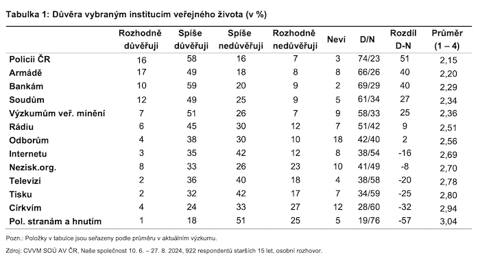 Největší důvěře ze zkoumaných veřejných institucí se těší policie ČR (74 %), banky (69 %) a armáda (66 %), nejméně lidé důvěřují politickým stranám a hnutím (19 %). Výraznější převaha důvěry nad nedůvěrou je patrná také v případě soudů a výzkumů veřejného mínění.