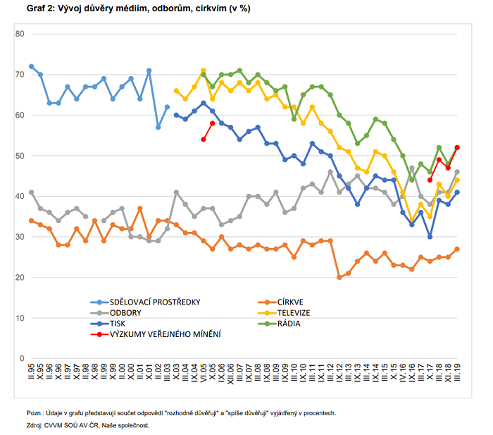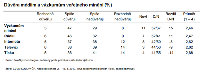 V porovnání s předchozím šetřením Centra pro výzkum veřejného mínění (CVVM) z listopadu 2018 byl v aktuálním šetření z března 2019 zaznamenán vzestup důvěry výzkumům veřejného mínění, televizi (při poklesu nedůvěry), odborům a rádiu (při souběžném nárůstu nedůvěry). Nedůvěra poklesla také internetu a tisku.