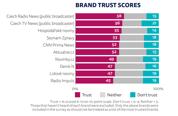 Celková důvěra ve zpravodajství meziročně klesla o dva procentní body na 34 %. K nejdůvěryhodnějším médiím patří stále Český rozhlas, Česká televize, následují Hospodářské noviny, Seznam Zprávy a CNN Prima News.