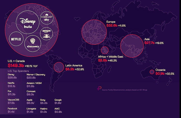 V globálním hledisku loni nejvíce investovala společnost The Walt Disney, a to 28,6 mld. dolarů. Na druhém místě se umístila Warner Media s Discovery, které alokovaly do vývoje obsahu 20,8 mld. dolarů. Streamovací služba Netflix vydala 15,1 mld. dolarů a Amazon po akvizici MGM 11,8 mld. dolarů.