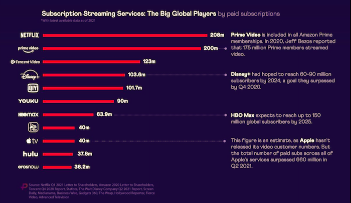Ze streamovacích společnosti je nejsilnějším hráčem, co se počtu předplatitelů týče, Netflix, jenž přidal za poslední čtvrtletí 1,5 milionu předplatitelů k celkovým 209,18 mil. S 200 mil. předplatitelů je na druhém místě Prime Video od Amazonu. Disney přilákalo 103,6 mil. zákazníků.