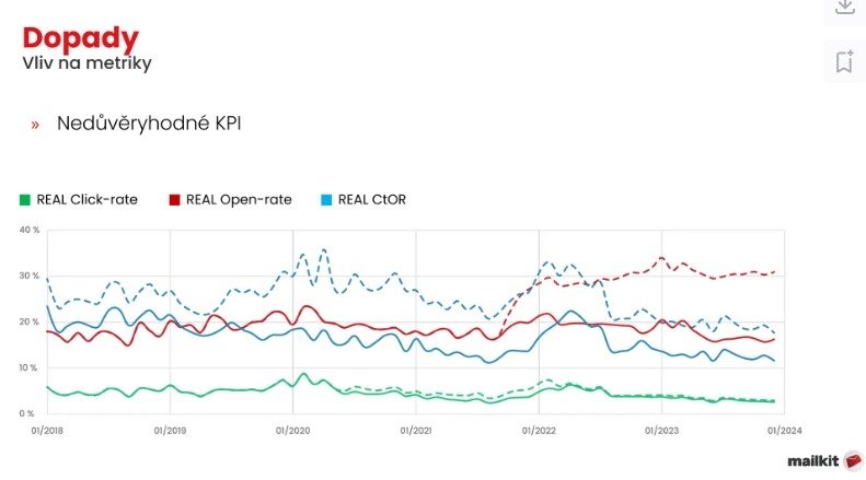 Také uváděný parametr „otevření“ je zkreslený. Míra otevření emailu se měří maximálně podle dvou trackovacích pixelů, jejichž přesnost je nízká. „Když jsme porovnávali naše data s daty poskytovatelů, tak jsme zjistili, že rozdíl je od 30 % do 50 % ve prospěch toho, jak to měří poskytovatel,“ doložil. Olexa rovněž upozornil na změny, které přinesl Apple se svým MPP (Mail Protection Privacy) zavedeným v září 2021, což vedlo k masivnímu nárůstu robotických otevření.