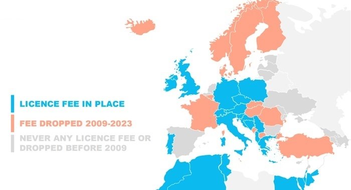 Ke konci roku 2023 se poplatky za média veřejné služby platily v 21 zemích (39 %), které jsou členy EBU. Ukazuje to zpráva Evropské vysílací unie (European Broadcasting Union - EBU), která sdružuje televizní a rozhlasové veřejnoprávní provozovatele. Pokud by se zohlednily jen členské země Evropské unie (EU), jde o 37 % zemí, ve kterých se poplatek používá (10 zemí z 27).