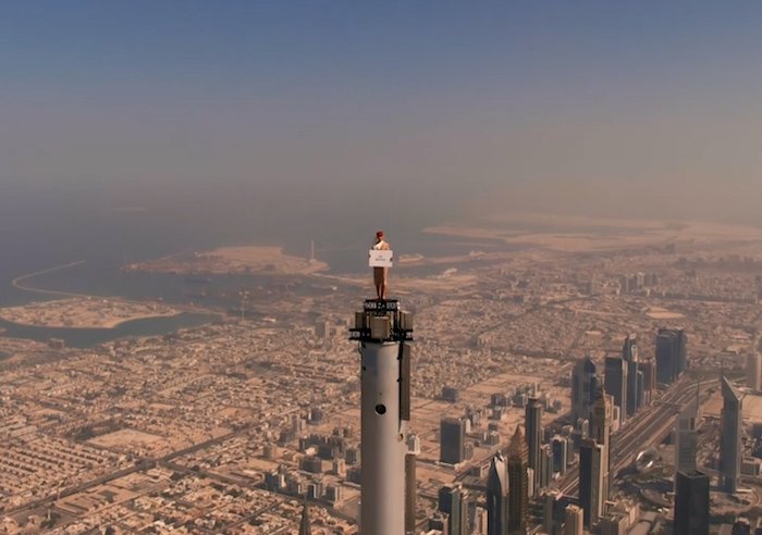 Letecká společnost Emirates připravila novou reklamní kampaň, kterou natáčela na špičce nejvyšší budovy světa Burdž Chalífy, tyčící se 828 metrů nad zemí. Na nejvyšší bod se postavila letuška, která se tak stala jednou z mála osob, která měla možnost se tam dostat, například vedle Toma Cruise či korunního prince Dubaje.