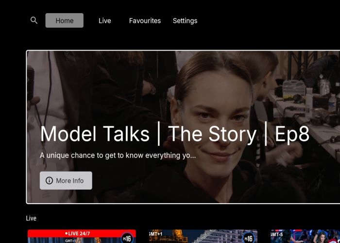 Nový design aplikace Fashion TV nyní nabízí přehlednější navigaci díky čtyřem hlavním položkám menu umístěným v levém horním rohu obrazovky: Home, Live, Favourites a Settings. Toto uspořádání zajišťuje rychlý přístup k nejdůležitějším funkcím aplikace. Úvodní obrazovce dominuje velká dlaždice přes celou šířku, která upoutá pozornost diváka. Vylepšením jsou animované dlaždice, které po krátké době začnou automaticky přehrávat ukázky vybraných videí přímo v náhledu. Tato funkce umožňuje uživatelům rychle prohlédnout obsah bez nutnosti otevírat jednotlivá videa.
