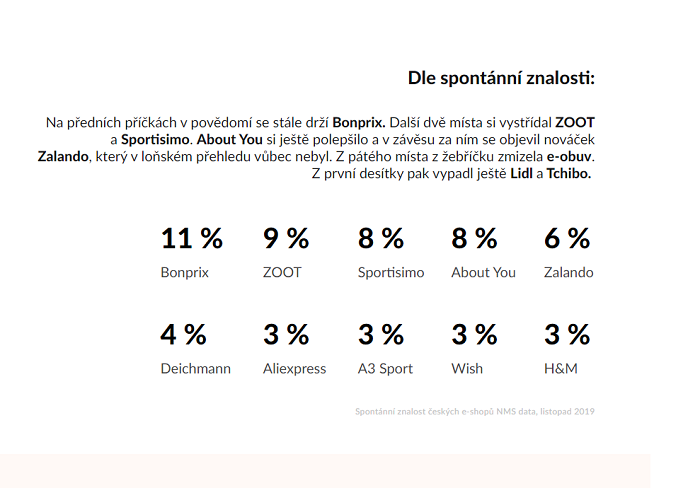 Spontánní znalost se také lehce změnila. Na prvních třech místech je Bonprix 11%, Zoot 9 % a Sportisimo 8 %. Z první desítky ale vypadl obchodní řetězec Lidl a společnost Tchibo.