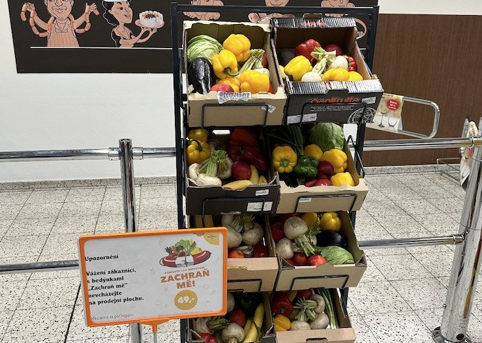 V bedýnkách se ocitá ovoce a zelenina v průběhu dne podle přebytků plodů v regálech. „Vždy jde o výpěstky ve velmi dobré kondici, které když urychleně najdou svého strávníka, jsou zaručeně kvalitní potravinou. Máme stanovená přísná pravidla pro skladbu bedýnek. Ta zní čtyři druhy ovoce či zeleniny alespoň o váze tří kilogramů. Častými artikly v bedýnkách jsou sezónní produkty jako nyní rajčata, okurky, kapie, výpěstky jednodenní spotřeby, jakými jsou ředkvičky či jarní cibulka, ale nechybí mnohdy citrusy, kiwi a podobně,“ dodává Aneta Turnovská. Zákazníci bedýnky najdou na stojanech s názvem „Zachraň mě“ u pokladen.