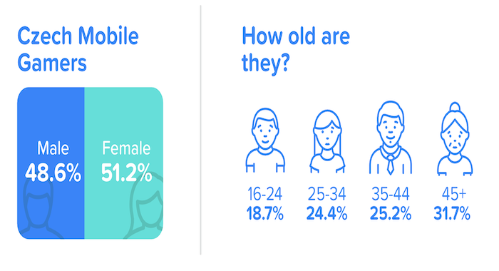 Z hlediska věkové struktury je hraní her na mobilech rozvrstveno relativně rovnoměrně mezi mladší i střední věkové skupiny. Určitým překvapením může být fakt, že o něco více mezi hráči mobilních her převládají ženy (51,2 %). Největší skupinu českých mobilních hráčů tvoří věková skupina 45+ (31,7 %). Následuje skupina 35-44 (25,2 %) a 25-34 (24,4 %). Věková skupina 16-24 let, u které se hraní her nejvíce předpokládá, tvoří podle AdColony 18,7 %. Data postihují nejen klasické hráče, ale také běžnou populaci, která si hraním her typu Candy Crush, Angry Birds nebo Fruit Ninja vyplňuje svůj volný čas.
