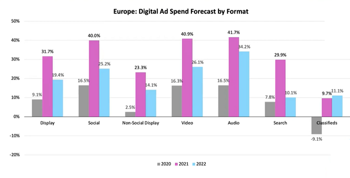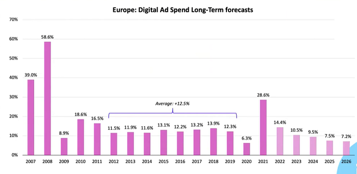 Reklamní investice v digitálu mají podle čerstvého odhadu mezinárodní organizace IAB Europe vzrůst v roce 2022 na evropském kontinentu o 14,4 % oproti roku 2021. Přestože oproti letošnímu roku se jedná o zpomalení dynamiky (pro rok 2021 odhadován meziroční růst o 28,6 %), jedná se stále o citelný nárůst. Na úterním semináři IAB to uvedl analytik Daniel Knapp.