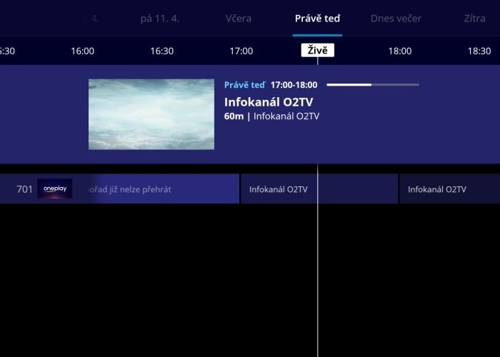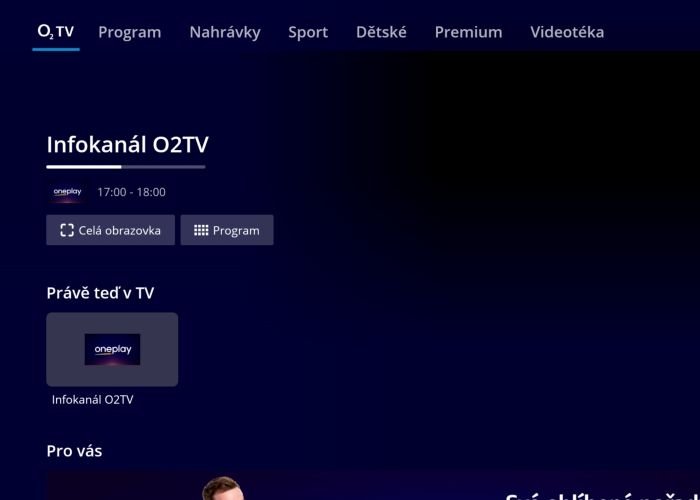 Původní aplikace O2 TV zatím nepřestala fungovat, ale nadále je pro již přemigrované zákazníky k dispozici ve velmi omezené míře. Po spuštění naběhlo samotné menu i služba, nebyl zde už ovšem k přehrávání žádný obsah. Místo kompletní nabídky mě tu čekala pouze jediná nová programová pozice – Infokanál O2 TV. Migraci pak nadále podpořila i speciální dlaždice „Pro vás“ informující o dostupnosti obsahu ve Oneplay. Jedna z položek však zůstává nadále funkční, a to je (placená) Videotéka, kterou už v nové službě nenajdete. Předpokládám, že se tak děje z důvodu probíhající migrace zákazníků O2 TV ve vlnách, a tudíž nutné dostupnosti sekce pro nepřemigrované klienty.