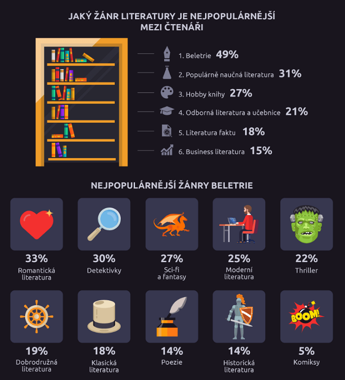 Nejčastějším důvodem, který vede až 43 % dotazovaných k nákupu, je vášeň ke knihám. Čtvrtina pořizuje knihy jako dárek, 21 % respondentů nakupuje knihy kvůli studiu nebo práci a pro 11 % jsou nákupy knih odpočinkovým rituálem. Největší zájem mají Češi o beletrii (49 %), a to nejčastěji o milostné romány (33 %), detektivky (30 %) a sci-fi a fantasy (27 %). Další úspěšnou kategorií je populárně naučná literatura (31 %) nebo hobby knihy (27 %).
