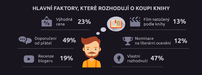 Pro nákup knihy je rozhodujícím faktorem pro Čechy zejména doporučení od přátel, kterým naslouchá 49 %. Na základě vlastního rozhodnutí si knihy kupuje 47 % dotázaných. A mezi další faktory patří například výhodná cena (23 %), ale i recenze knižních blogerů (19 %), film natočený podle knižní předlohy (13 %) nebo nominace na literární ocenění (12 %). Přestože většina respondentů je spokojená s cenami knih (36 %), či je dokonce považuje za nízké (24 %), téměř třetina se shodla na tom, že jsou mírně předražené a jen 9 % uvedlo, že jsou příliš vysoké.