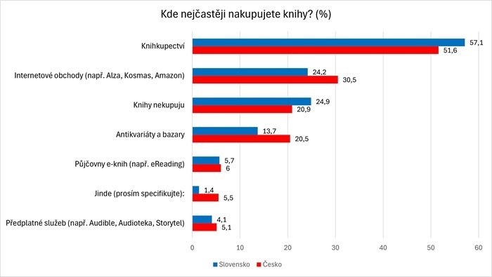 Ze srovnání vyplynulo, že čtenáři na Slovensku kupují více než Češi knihy v knihkupectví (57 %) a ve srovnání s českými čtenáři méně nakupují knihy na e-shopech (24 %). Ve srovnání se Slovenskem je v Česku také silnější tradice antikvariátů a bazarů, kde knihy pořizuje pětina populace (21 %), zatímco na Slovensku 14 %. Způsoby dalšího pořizování knih nebo elektronických knih jsou podobné.