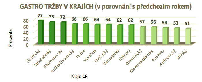 Naopak se „dařilo“ v Libereckém a Královéhradeckém kraji nebo na jižní Moravě. Dobře si vedl Středočeský kraj, kde se – stejně jako v Praze – po celou dobu restrikcí zachovalo provoz největší procento gastro podniků. Přesto ani tyto kraje zdaleka nedosáhly hodnot srovnatelných s předchozím rokem.